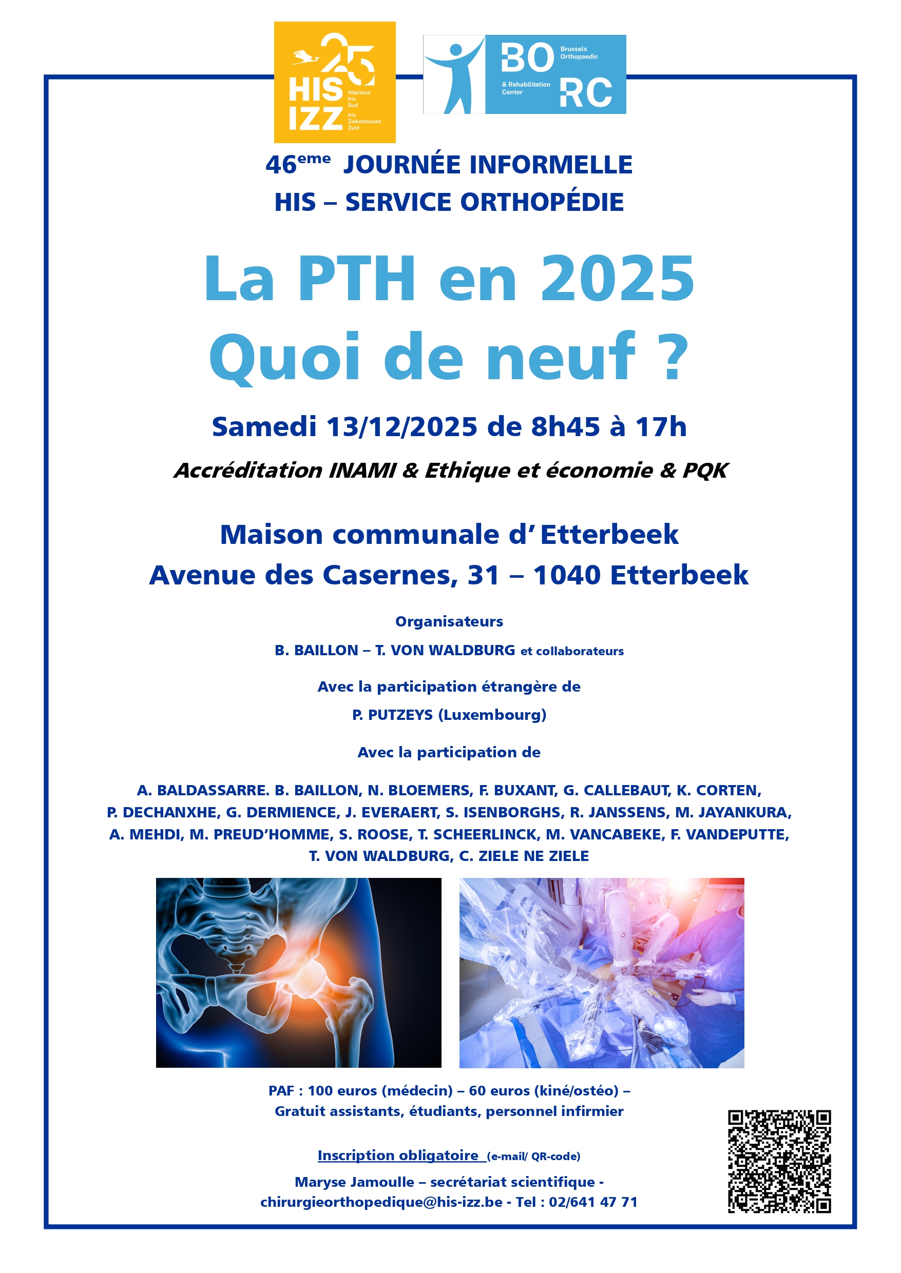 INFORMATIONS PRATIQUES Date : le samedi 7 décembre 2024 Heure : de 8h30 à 17h00 Lieu : Hôtel de Ville de Saint-Gilles Adresse : Place M. Van Meenen 39 1060 Bruxelles Accréditation INAMI (24019943) + PQK Inscription obligatoire par mail chirurgieorthopedique@his-izz.be