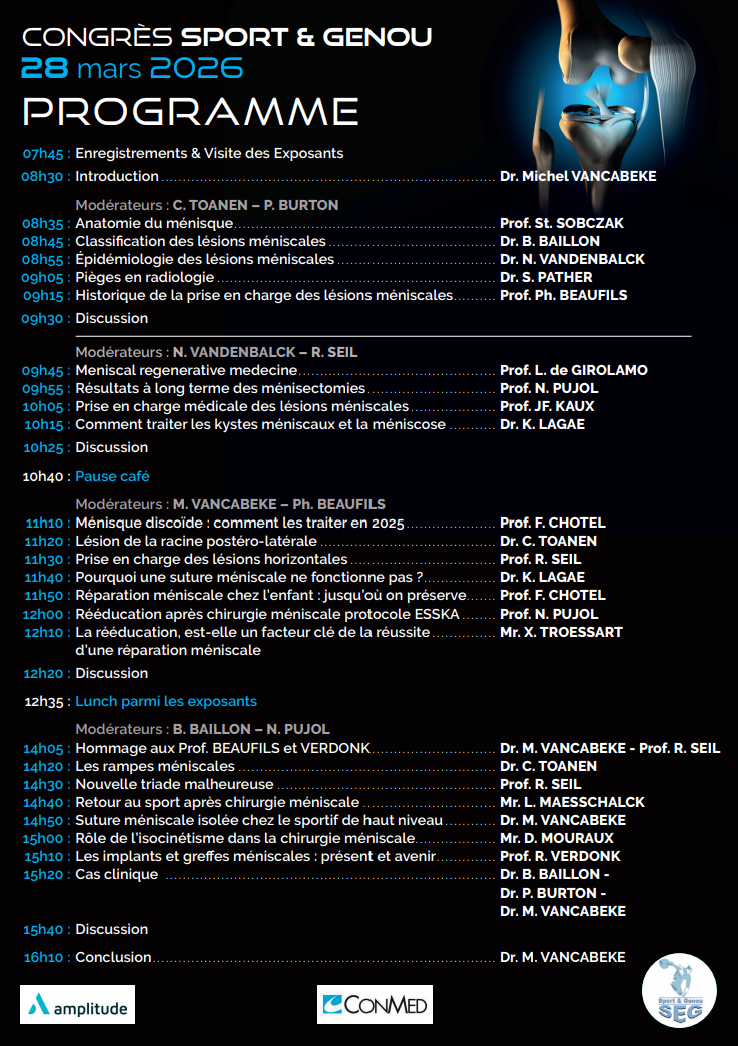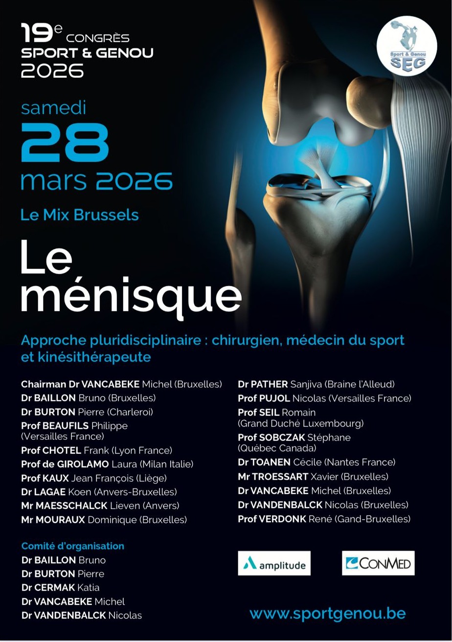 - Hand and Fingers ( thumb, longs) (Dr Ledoux Amandine) 12h00 : Q & A 12h20 : LUNCH 13h30 : Nerve and Tendon (Dr Goeminne – Dr Libouton) 13h30 : Clinical exam of the tendon (Flexor, extensor) ( Dr Farhat Houssein) 13h50 : Clinical exam of the nerve (Dr Olivier Barbier) 14h10: Q & A 14h30 : Oncology ( Dr Thomas Schubert & Dr Bilal Kapanci) Part 1 Bone lesions – Moderators : Gwen Sys and Bilal Kapanci 14h30 : Basics of radiology in bone tumors (Dr Thomas Schubert) 14h50 : Leave me alone lesions, pediatric population. (Dr Pierre-Louis Docquier) 15h10 : Pathological fracture : an emergency but not for surgery. (Dr Hazem Wafa) 15h30 : Q/A and Break Part 2 Biopsies and sof tissue lesions Moderators : (Dr Hazem Wafa and Dr Thomas Schubert) 15h45: Principles of biopsy, (Dr Bilal Kapanci) 16h05 : Imaging and work up of soft tissue lesions (Dr Annelies Van Beek) 16h25 : Soft tissue sarcoma management (Dr Gwen Sys) 16h45 : Q/A 17h00 : Finish and cocktail
