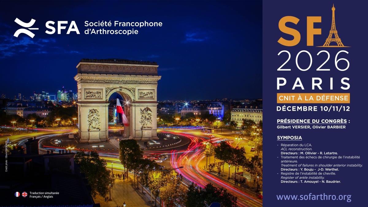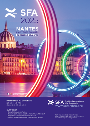 Société mise à l’honneur : la SFA (Société Francophone d'Arthroscopie) Nation invitée : Italie - SIOT Sociétés internationales invitées : AAHKS, AO Recon, APOA, EKS, Esska, IHS, JOA